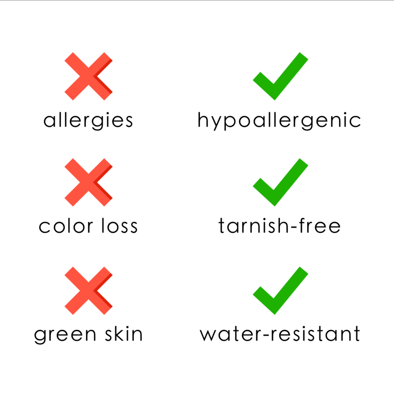WATERPROOF, HYPOALLERGENIC, AND TARNISH RESISTANT.
