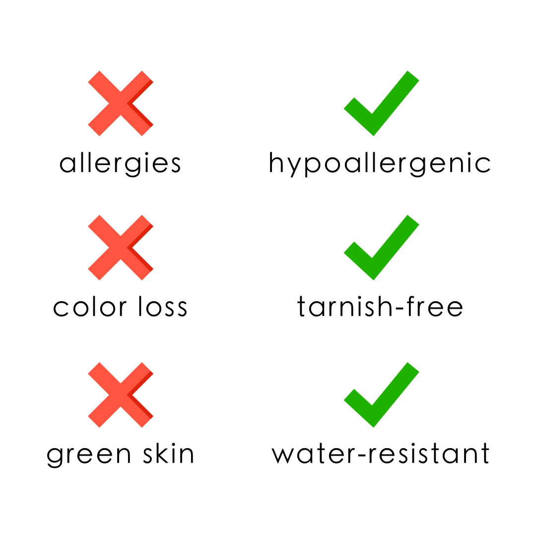 WATERPROOF, HYPOALLERGENIC, AND TARNISH RESISTANT.
