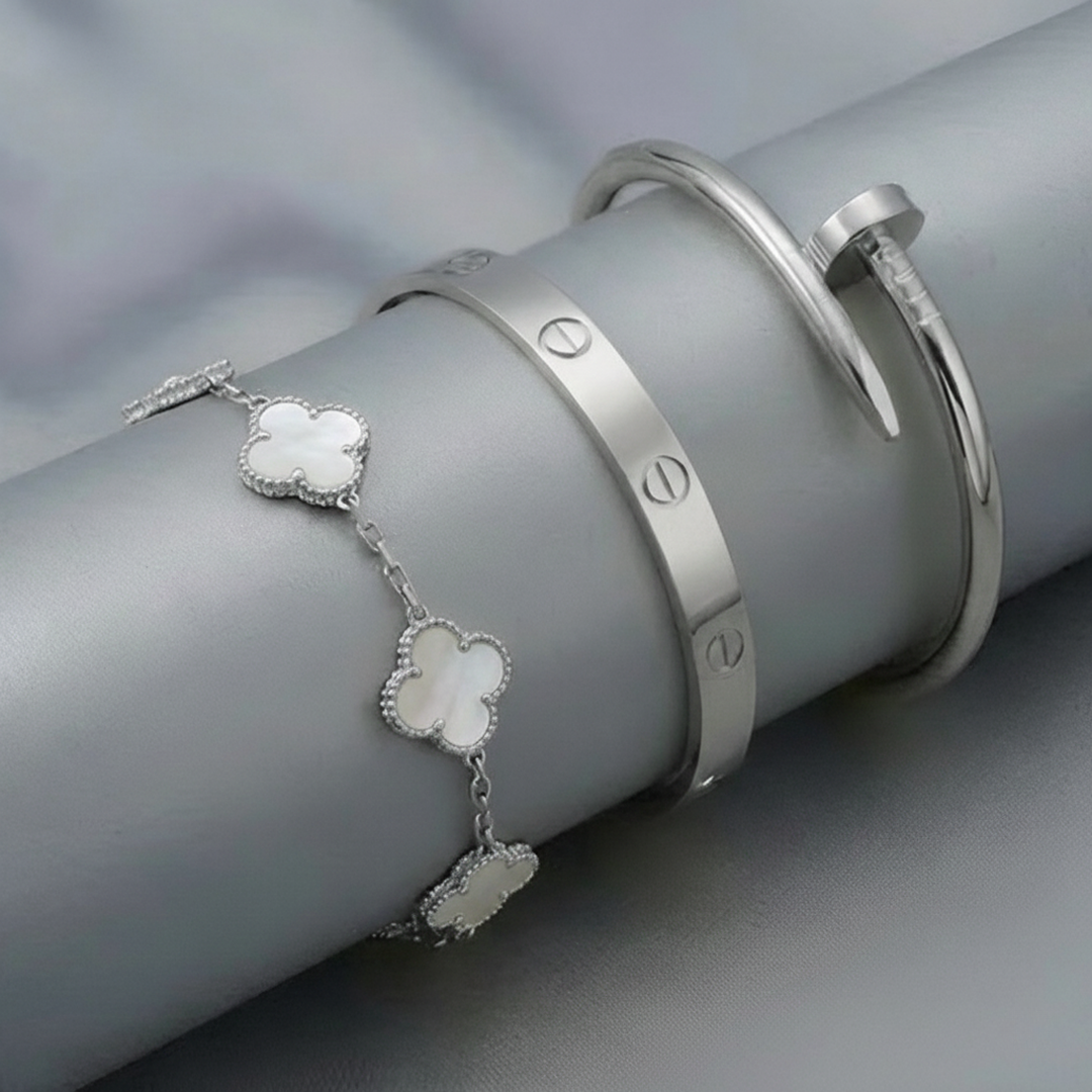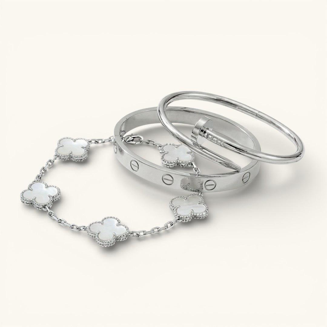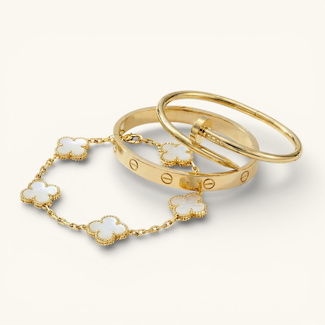 • Trinity & Clover Bracelet: A delicate and adjustable bracelet (16+5 cm) with charming details, available in gold or silver.