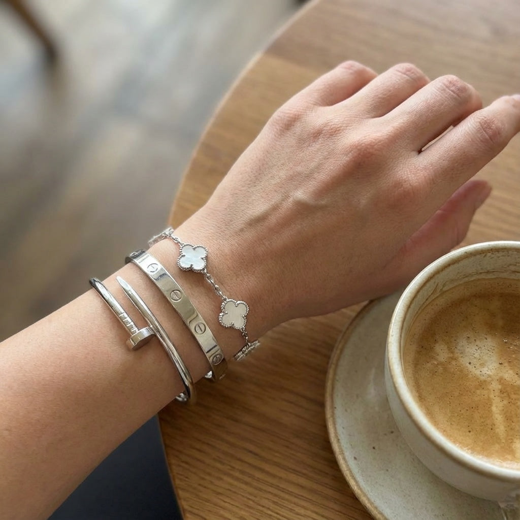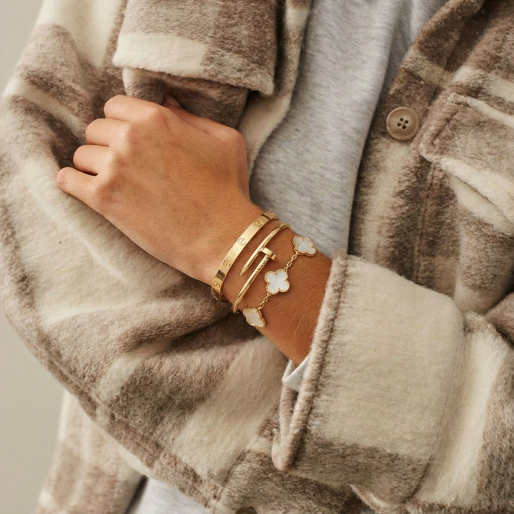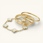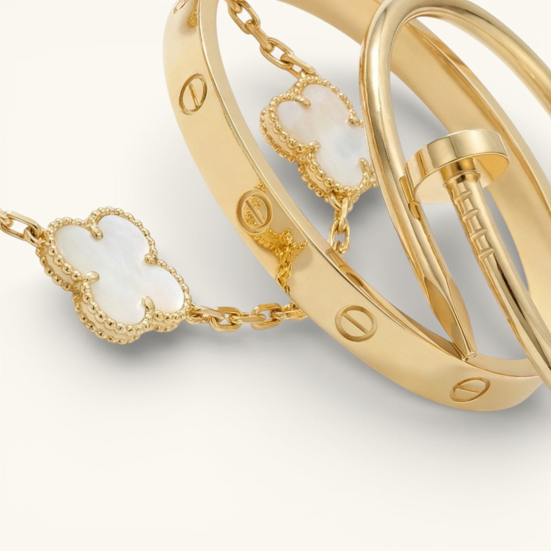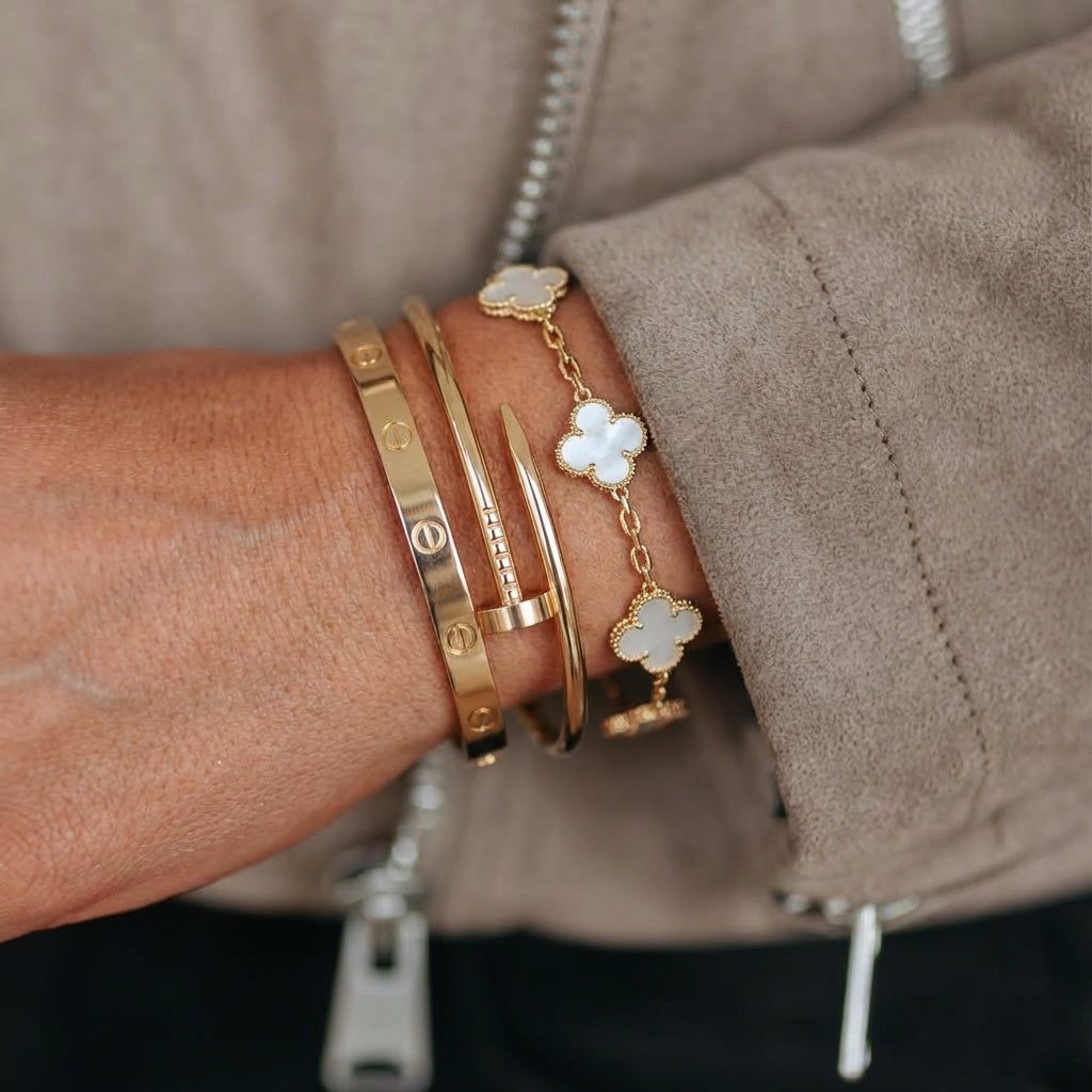 • Trinity & Clover Bracelet: A delicate and adjustable bracelet (16+5 cm) with charming details, available in gold or silver.